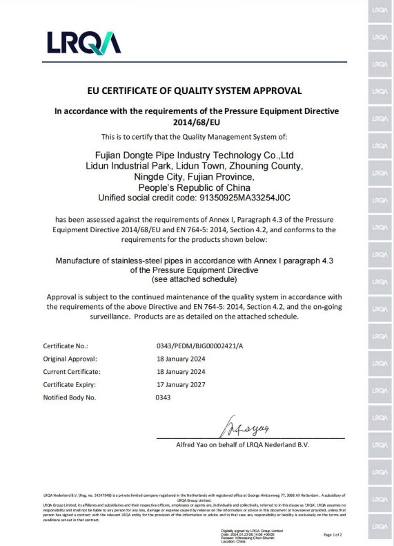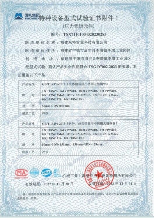 在质量管理方面,东特管业建立了全面的质量保证体系,确保了产品的高标准和可靠性。公司已取得的管理体系认证包括:特种设备(压力管道元件)制造许可证(A、B 级)、相关特种设备型式试验证书、GB/T 5310-2023《高压锅炉用无缝钢管》证书、欧盟承压设备指令(PED)认证证书、ISO 9001 质量管理体系认证、ISO 45001职业健康安全管理体系认证证书。